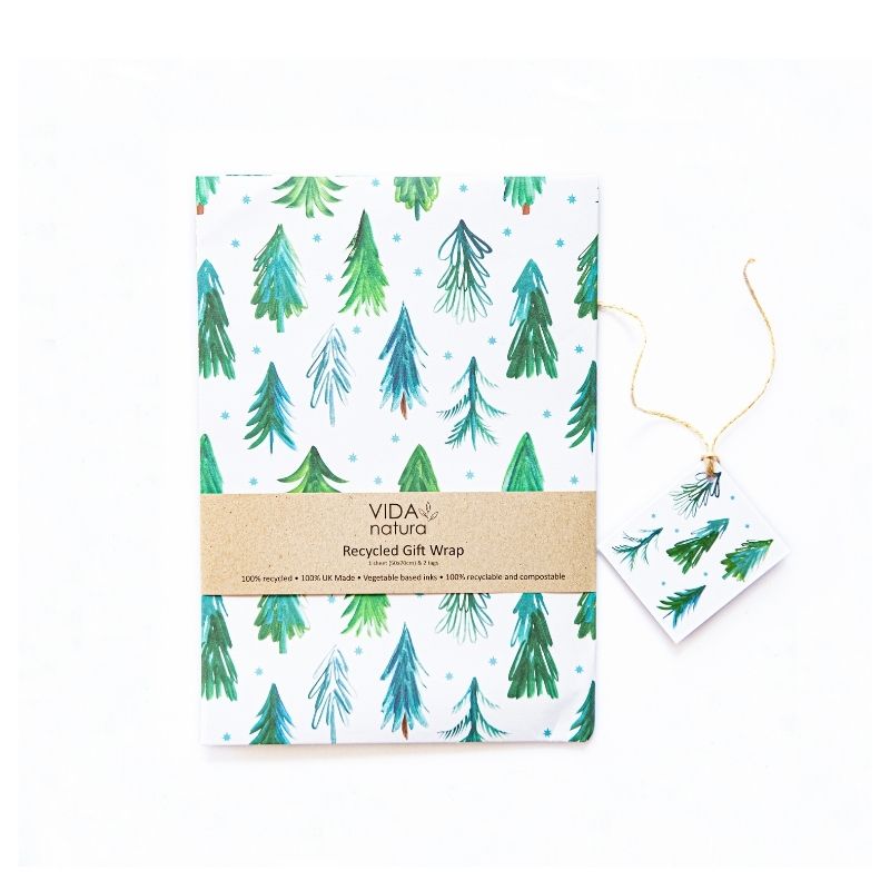 Recycled gift wrap, 100% UK made, vegetable based inks, recyclable and compostable.